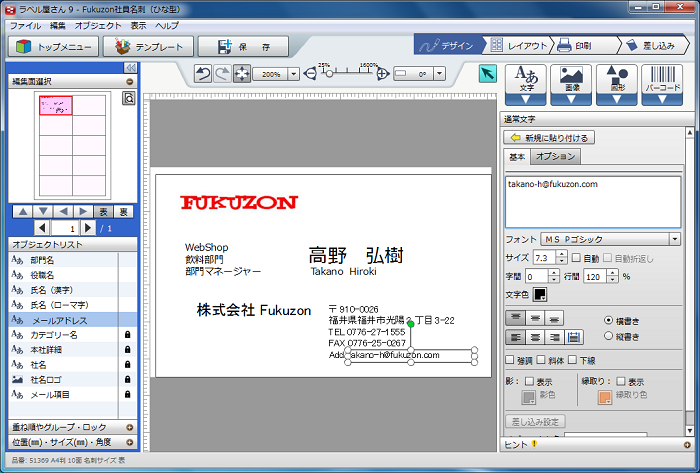 名刺作成専用ソフトを使って、すでに作成された用紙設定を元に、データを適切な場所に正確に入力し、名刺を作成します。